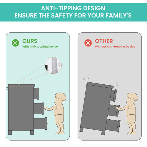 - Each drawer is equipped with smooth metal rails on both sides for easy pull-outs and antique style white aluminum pulls with gold trim; equipped with an anti-tip device that can be mounted on the back of the cabinet and on the wall to improve the safety of the cabinet.
